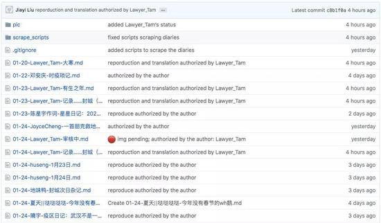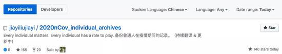 第二个项目名叫“2020nCov_individual_archives”,这个项目GitHub趋势榜中文项目榜首。该项目的口号是:Every individual matters. Every individual has a role to play。中文介绍中写着“备份普通人在疫情期间的记录(持续翻译 & 更新中)”。