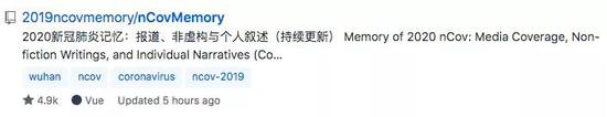 这个项目的中文名是“2020新冠肺炎记忆:报道、非虚构与个人叙述(持续更新)”,收录了2020年新型冠状病毒感染的肺炎(2019-nCoV, i.e., Novel Coronavirus Pneumonia, NCP)相关媒体报道、非虚构作品和亲历者个人叙述。